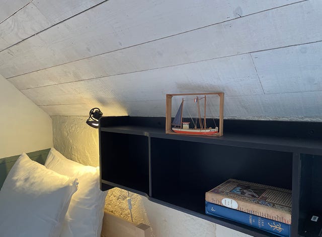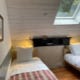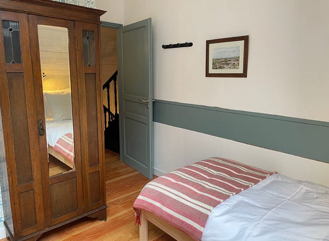 Upstairs: a bedroom with two single beds (90 x 200) and a 1/2 floor higher a second bedroom with a double bed (160 x 200), a shower room with a toilet.