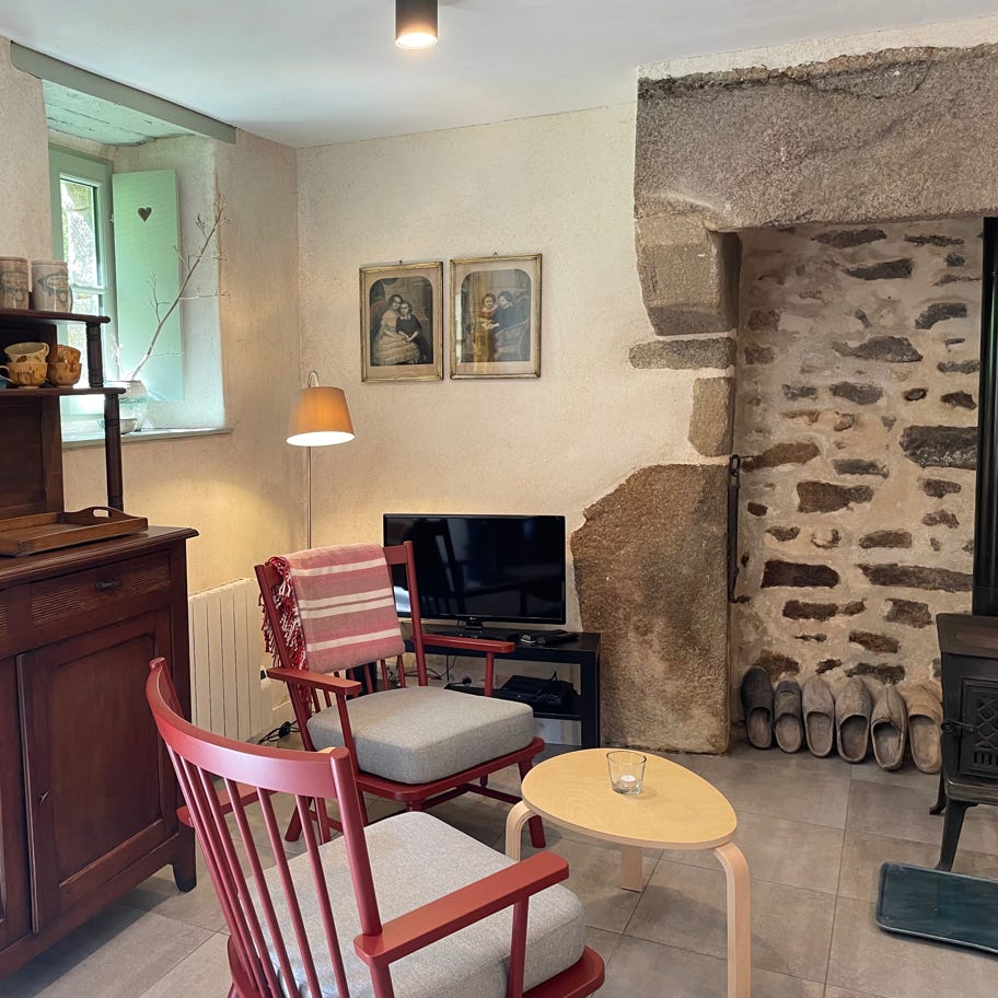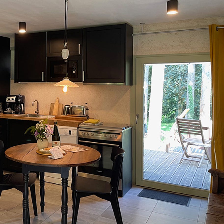 Our cottage for two is the old bakery, the Oven House, of the manor, the Ti forn in Breton. It is a single-storey rental with a separate entrance. This 30 m² studio is composed of a living room with kitchenette and a sleeping area with a double bed (160 x 200), a bathroom (shower, sink and toilet).